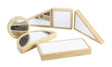 This set is comprised of 6 pieces in 5 different shapes (circle, square, rectangle, half-moon and 2 triangles) each with a scratch proof acrylic mirror on one side and a wipe clean surface on the other. The blocks are made from European beech and can be placed on a table flat or stacked on top of each other in open-play. They enable children to identify shapes, to draw on the wipe off surfaces and to use in the exploration of light and reflection too. The blocks come stored in a timber box measuring 20cmW x 20cmD x 5cmH.
